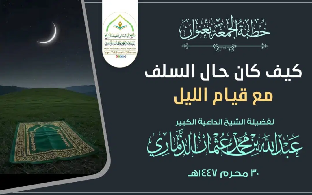 خطبة مؤثرة بعنوان ﴿كيف كان حال السلف مع قيام الليل﴾ الأثنين ۳ صفر ۱٤٤۷ هـ الموافق ۲۸ يوليو ۲۰۲۵ مـ | الخطب | شارك بتعليقك ﴿كيف كان حال السلف مع قيام الليل﴾ خطبة مؤثرة لشيخنا الداعية الكبير: عبدالله بن محمد عثمان الذماري -حفظه الله تعالى- ألقيت في مسجد الصديق بمدينة ذمار بتاريخ 30 محرم 1447هـ PlayStop نافذة X ننصح الجميع بسماعها ونشرها لتعم الفائدة ═══ ¤❁✿❁¤ ═══ مقالات ذات صلة خطبة قيِّمة بعنوان ﴿فخلف من بعدهم خلف أضاعوا الصلاة واتبعوا الشهوات﴾ خطبة مؤثرة بعنوان ﴿أثر الدعاء في حياة المؤمنين﴾ كيف كان حال السلف مع قيام الليل اترك ردإلغاء الرد
